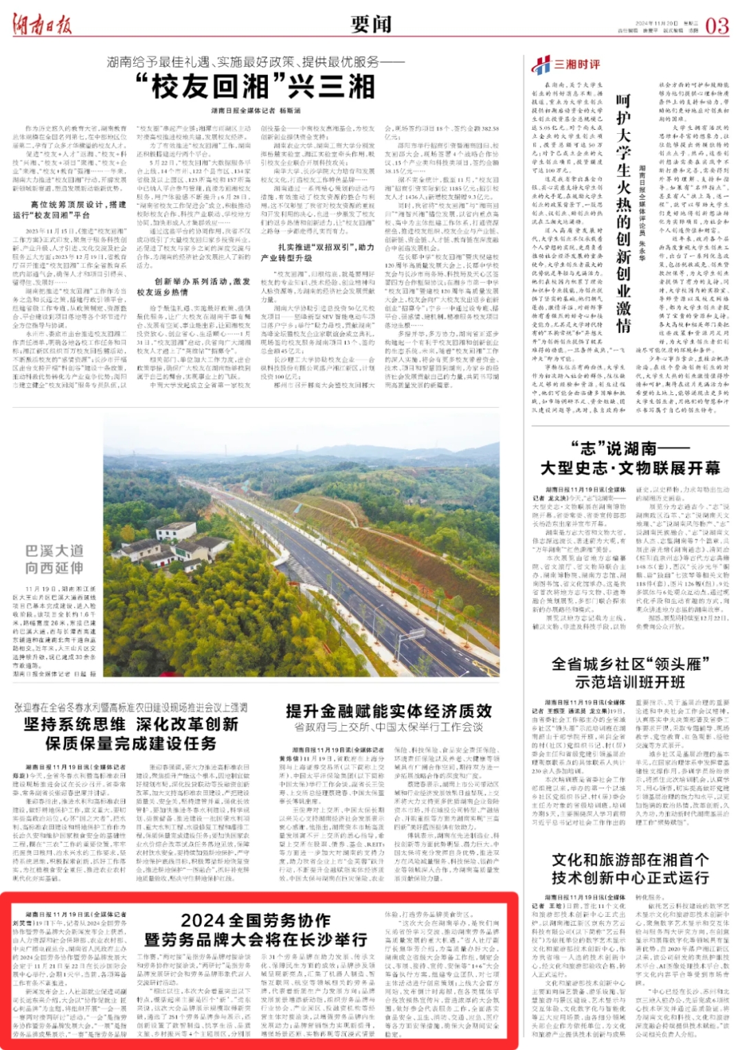 湖南日报11月19日讯(全媒体记者刘笑雪)19日下午,记者从2024全国劳务协作暨劳务品牌大会新闻发布会上获悉,由人力资源和社会保障部、农业农村部、中央广播电视总台、湖南省人民政府主办的2024全国劳务协作暨劳务品牌发展大会定于11月21日至22日在长沙国际会展中心举行,会期1天半。当前,各项筹备工作有条不紊推进。
