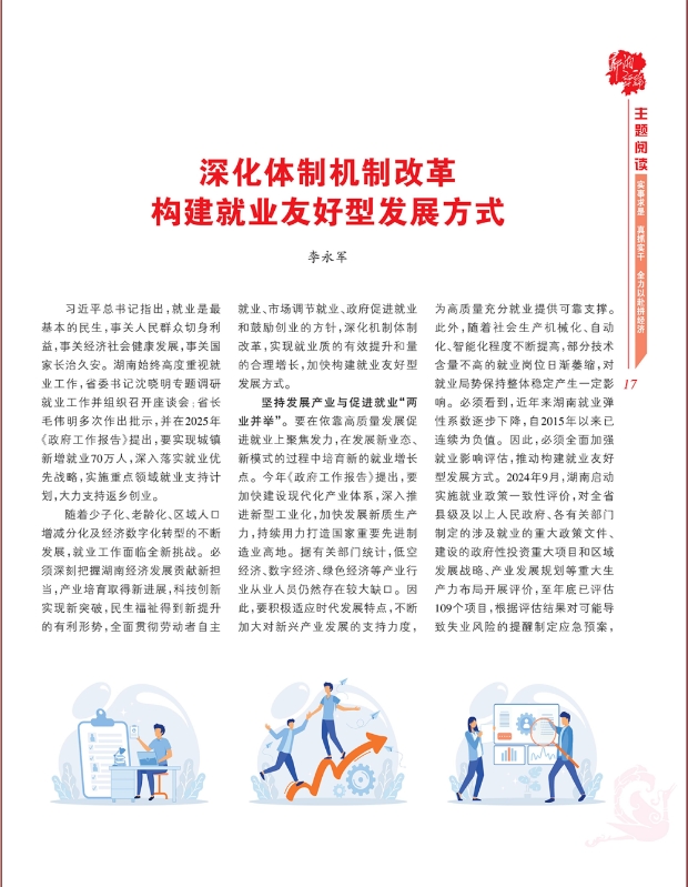 随着少子化、老龄化、区域人口增减分化及经济数字化转型的不断发展,就业工作面临全新挑战。必须深刻把握湖南经济发展贡献新担当,产业培育取得新进展,科技创新实现新突破,民生福祉得到新提升的有利形势,全面贯彻劳动者自主就业、市场调节就业、政府促进就业和鼓励创业的方针,深化机制体制改革,实现就业质的有效提升和量的合理增长,加快构建就业友好型发展方式。