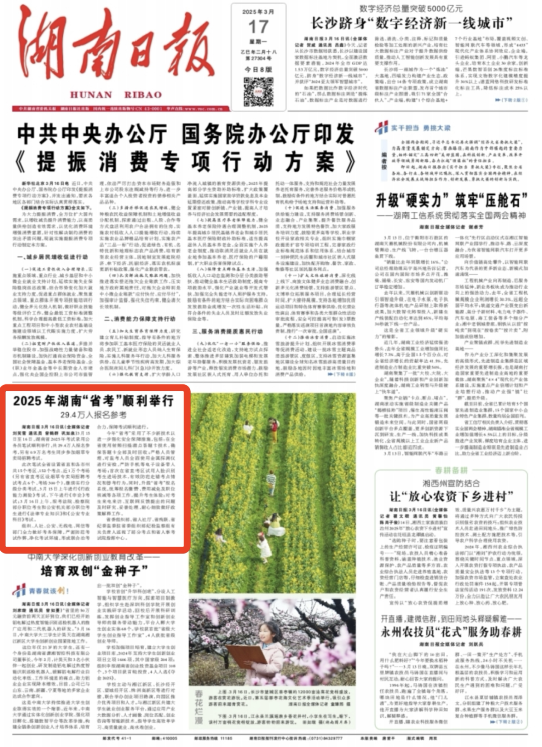 湖南日报3月16日讯(全媒体记者刘笑雪 通讯员曾鹤群 巩如泉)3月15日至16日,湖南省2025年考试录用公务员笔试顺利举行,共29.4万人报名参考,另有0.9万名考生同步参加烟草专卖局招聘考试。