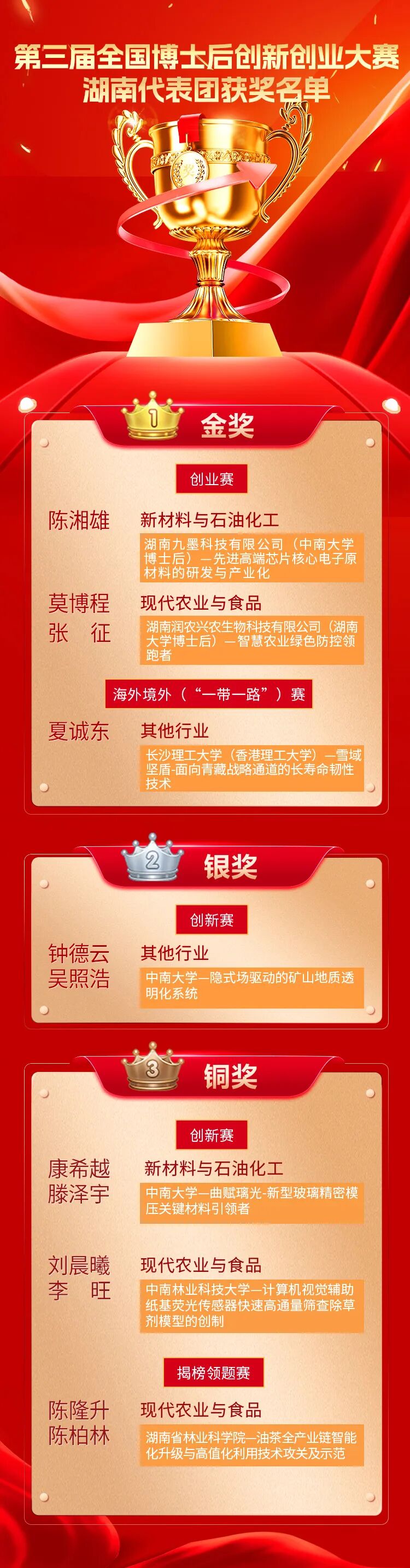 另外,来自中南大学钟德云、吴照浩项目团队获得银奖;中南大学康希越、腾泽宇项目团队,中南林业科技大学刘晨曦、李旺项目团队,湖南省林业科学院陈隆升、陈柏林项目团队获得铜奖。