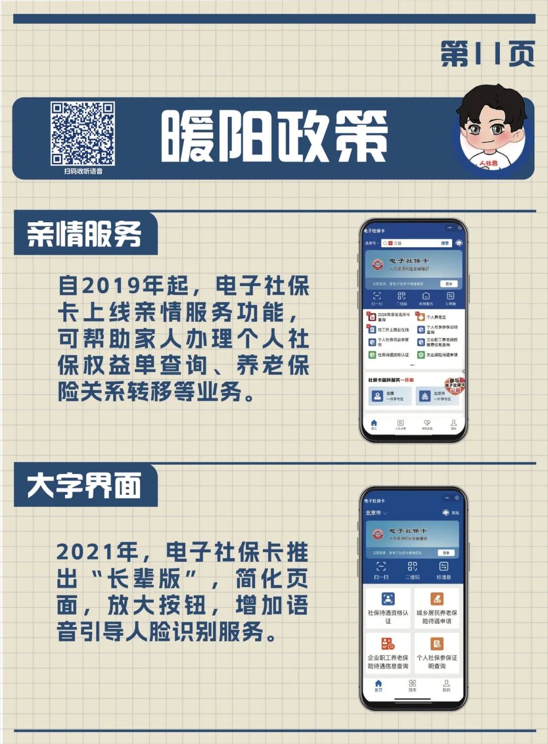 手册还贴心介绍了社保卡的“暖阳政策”,包括电子社保卡APP上线的亲情服务功能,推出的“长辈版”界面,增加的语音引导人脸识别服务,以及跨省通办服务。