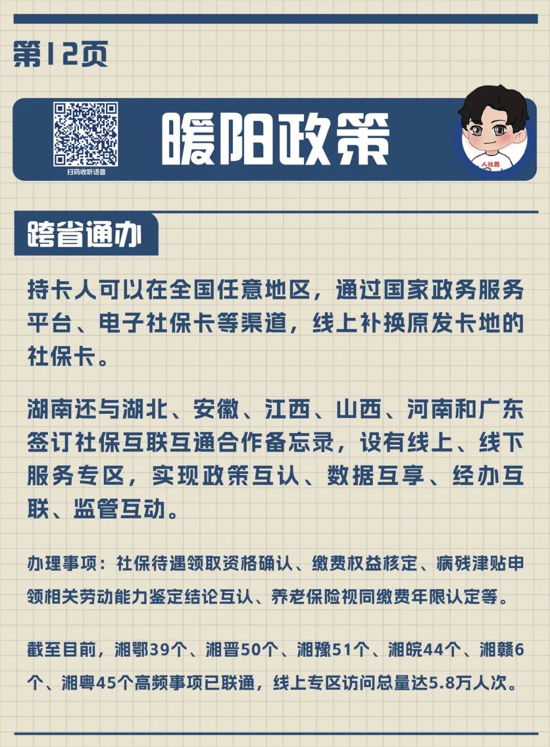为推进更多事项跨省通办,近年来,湖南创新实施“中部六省+广东省”社保互联互通,与各省开设线上服务专区,收获显著成效。截至目前,湘鄂39个、湘晋50个、湘豫51个、湘皖44个、湘赣6个、湘粤45个社保服务事项互联互通,各省线上专区总访问人次超5.8万。