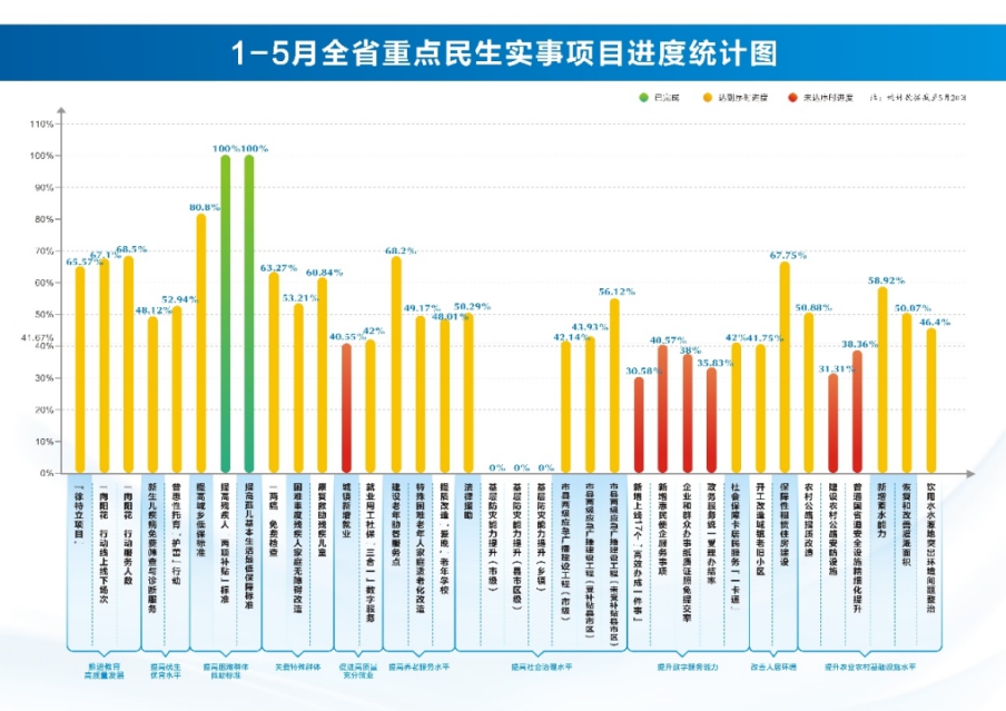 全省各地各部门落实省委、省政府的决策部署,全力实施民生可感行动,推进重点民生实事项目落地见效。截止5月底,十大重点民生实事24个项目中,提高残疾人“两项补贴”、提高孤儿和事实无人抚养儿童基本生活最低保障等2个项目已经提前完成,建成县域普通高中“徐特立项目”、家庭教育指导服务“向阳花”行动等18个项目按照序时进度推进。全省重点民生实事已经投入资金279.36亿元,完成全年投资预算的52.06%。全省200.6万余人通过“民生实事码上通”参与评价,收集处理回复群众意见建议1174条。各地各部门通过“民生实事码上通”发布工作动态3213条。省内教育医疗对口支持帮扶项目进展顺利。